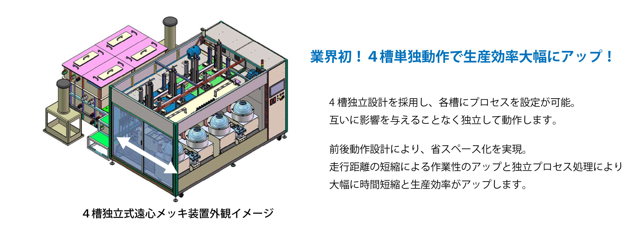 コンパクトな装置設計、金メッキも可能です。独立したメッキ槽で構成され、一つの槽で2系統のメッキ液供給系を有します。MLCC, MLCI共に、0201mm(008004in)から3225mm(1210in)まで対応可能です。