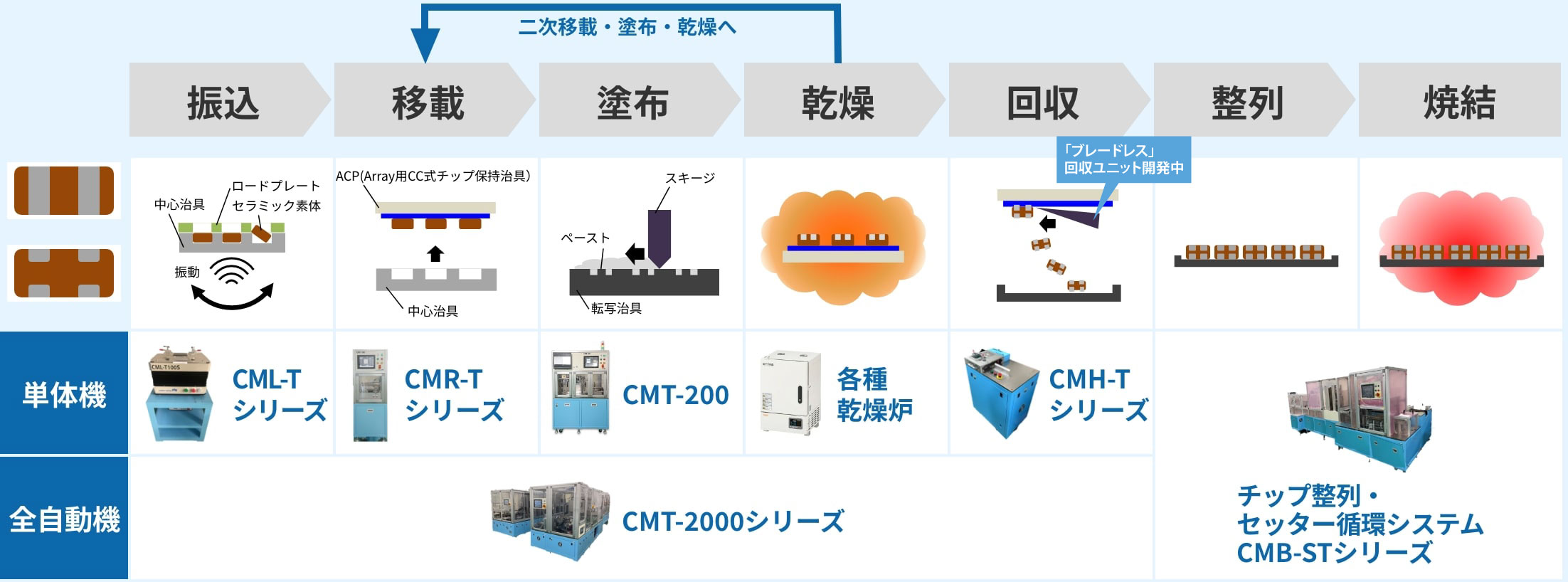 MLCC/MLCI/バリスタ/サーミスなど受動部品における次世代誘電体シート成形、内部電極⼯程、両端⼦‧多端⼦の外部電極塗布及び塗布前後⼯程に関するプロセス技術‧装置‧治具‧受託サービスをご提供。世界最⼩サイズ0201mm〜等、弊社の特許技術‧ユニークなプロセス技術がお客様のご要望にお応えします。