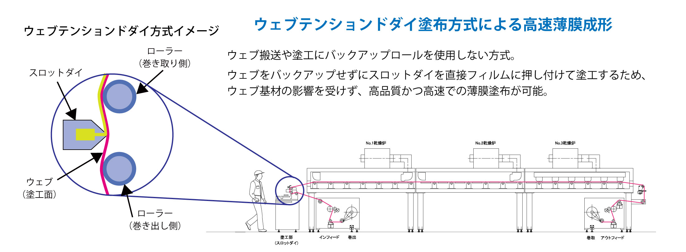 MLCC誘電体層(グリーンシート)を成形します。装置はフィルム巻き出し部、塗工部の